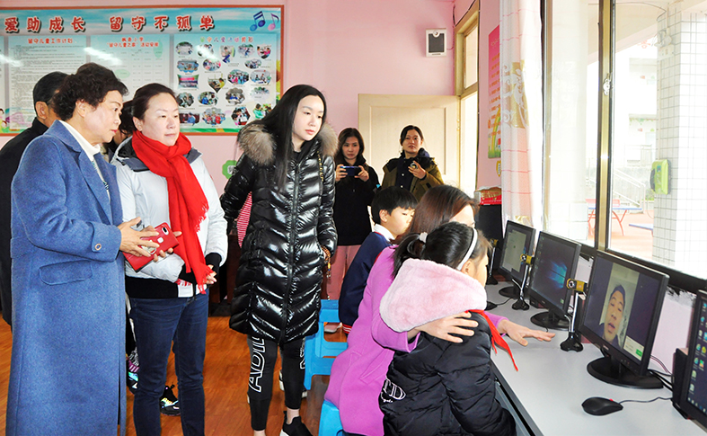 在考察现场可见“留守儿童教育帮扶中心”拥有温馨、人性化的室内布置。据介绍,学?;雇ü逖A羰匮牡资⒚扛隽羰匮淖诺蛋负土悼?,安排教师每周轮流值班管理并接受学生心理咨询等工作,为留守儿童开展学习上优先辅导、生活上优先照顾和活动上的优先安排。参观期间,花茂小学的留守儿童学生还与远在他乡工作的父母现场联机视频聊天??吹胶⒆用峭ü畔⒒际醺惺艿礁改傅墓匕?,考察团成员甚是感动。