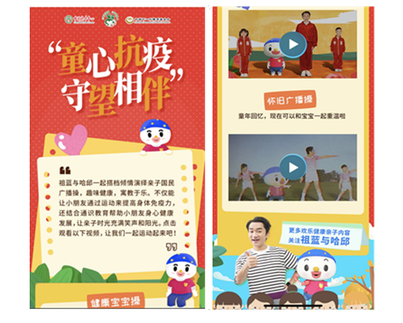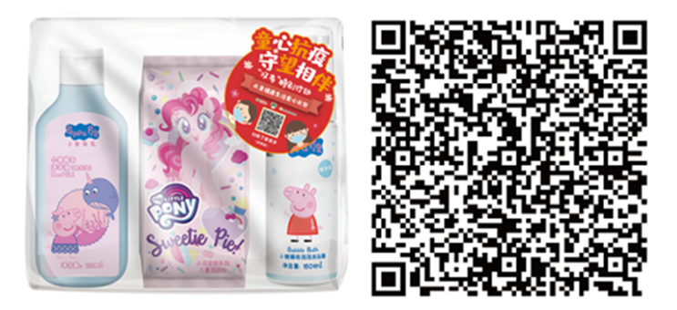 爱心健康礼包包袋上印制儿童防疫知识、居家亲子健康操等有益于儿童健康生活的二维码,让居家的儿童们在掌握正确的清洁防护知识的同时还能和爸爸妈妈一起享受亲子游艺的乐趣,扫下方二维码即可查看丰富内容。
