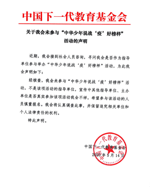 关于我会未参与“中华少年说 战‘疫’好榜样”活动的声明