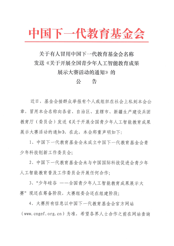 关于有人冒用中国下一代教育基金会名称发送《关于开展全国青少年人工智能教育成果展示大赛活动的通知》的公告