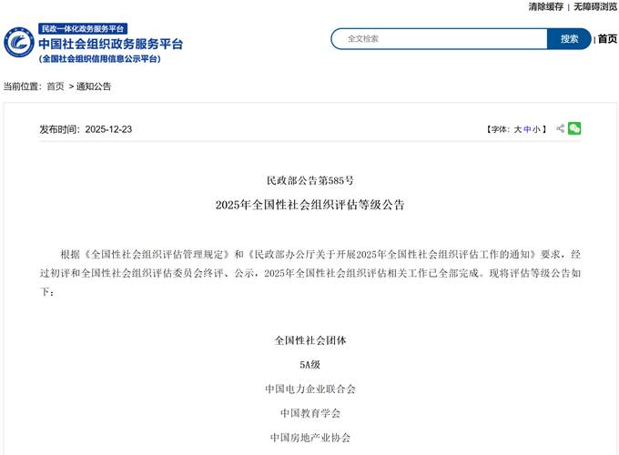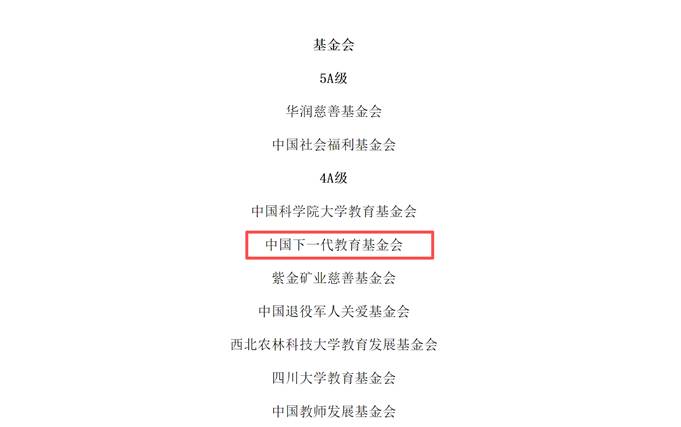 2025年12月23日,民政部发布《2025年全国性社会组织评估等级公告》,中国下一代教育基金会再次被民政部评估为4A级社会组织。(链接:https://chinanpo.mca.gov.cn/xwxq?newsType=2351&id=29079)