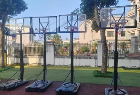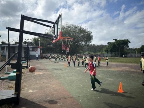 万宁市东和中心学校学生使用捐赠的篮球上体育课