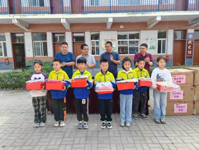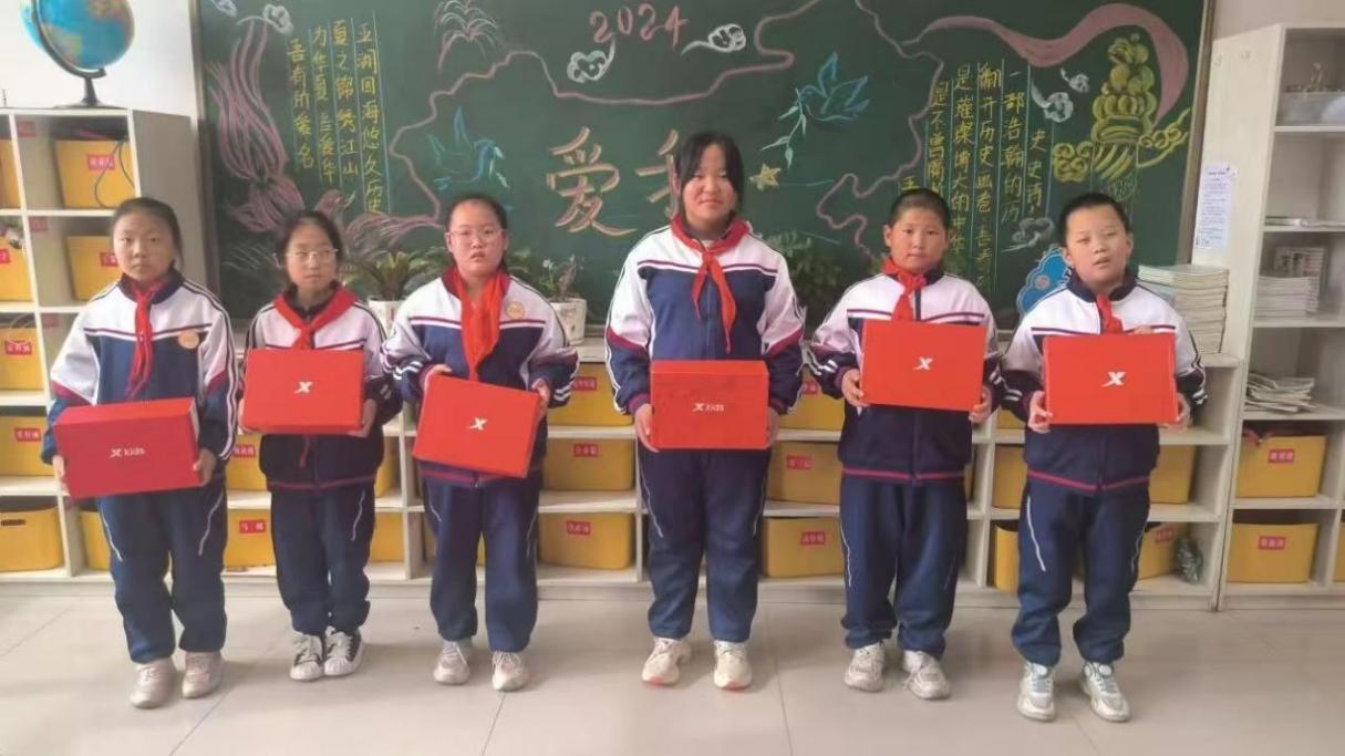 河北省威县潘店中心小学的孩子们收到运动鞋服