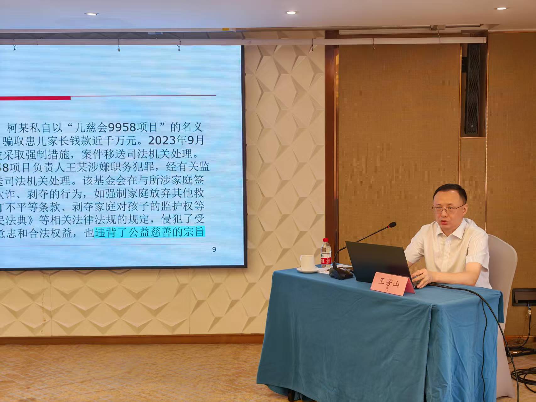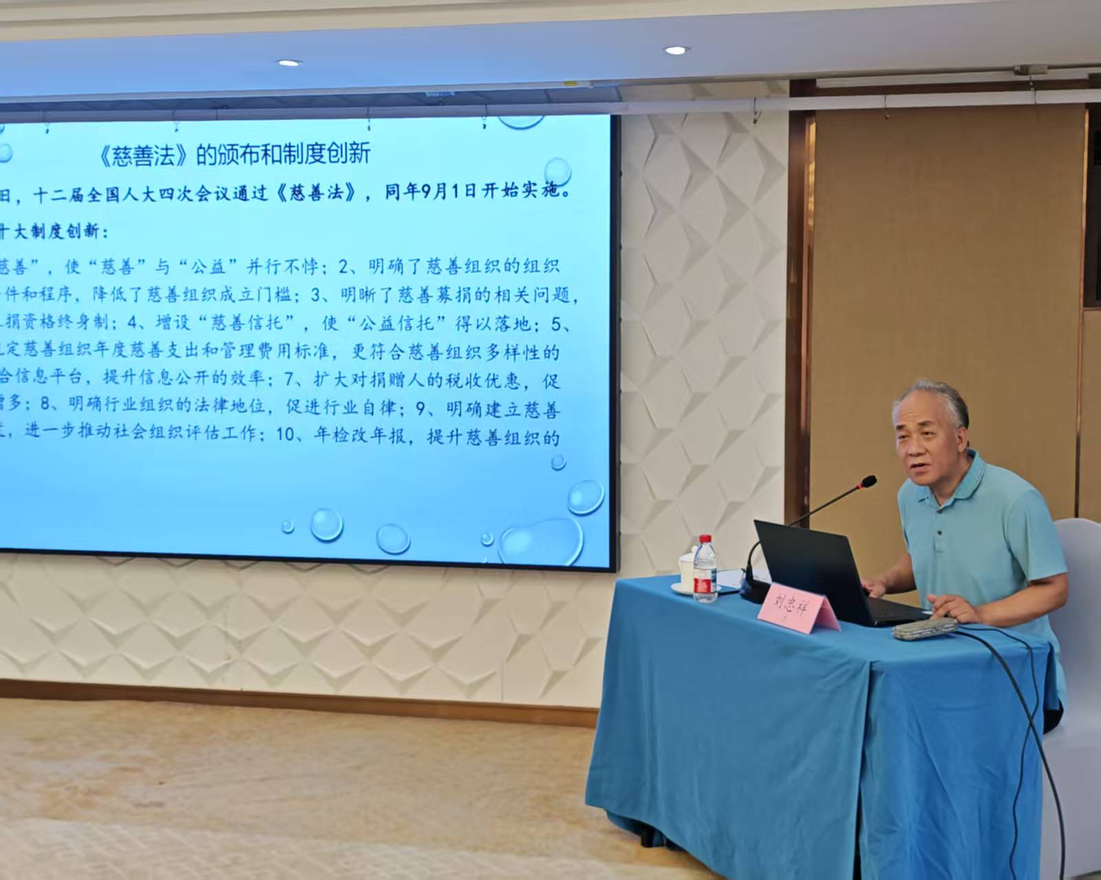 中国社会组织促进会副会长兼秘书长刘忠祥以“学习贯彻慈善法促进慈善组织规范发展”为题授课。他结合《中华人民共和国慈善法》《基金会管理条例》等法律法规,以及公益慈善领域突出问题专项整治要求,系统梳理了基金会发展现状与规范化建设中的常见问题。,针对新修订的《慈善法》,重点解读其 “十大制度创新”, 还就《慈善法》执法检查重点与实践应用要点进行深入解析,为基金会依法依规运营提供指引。