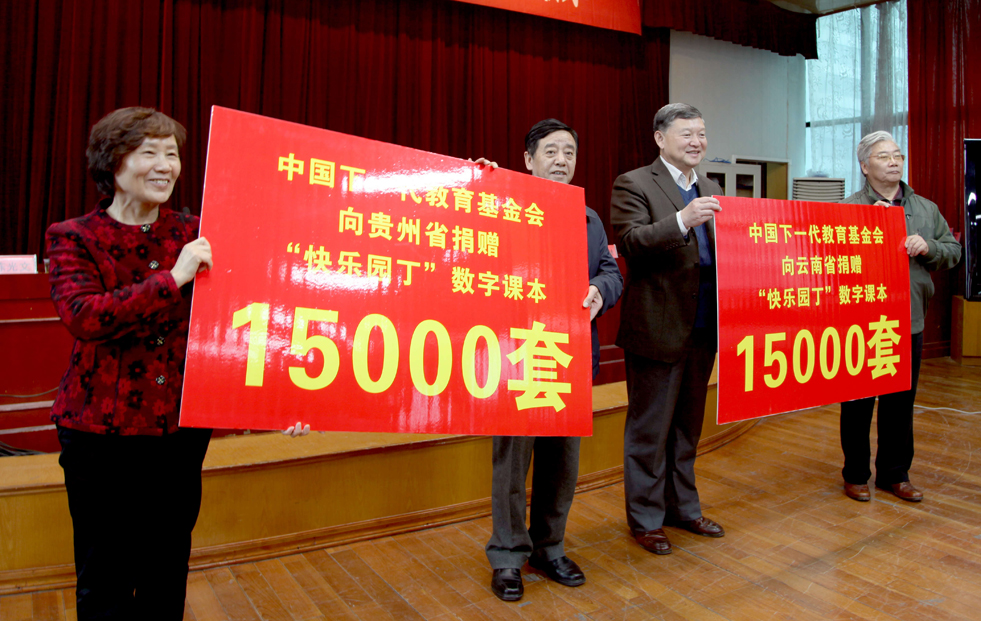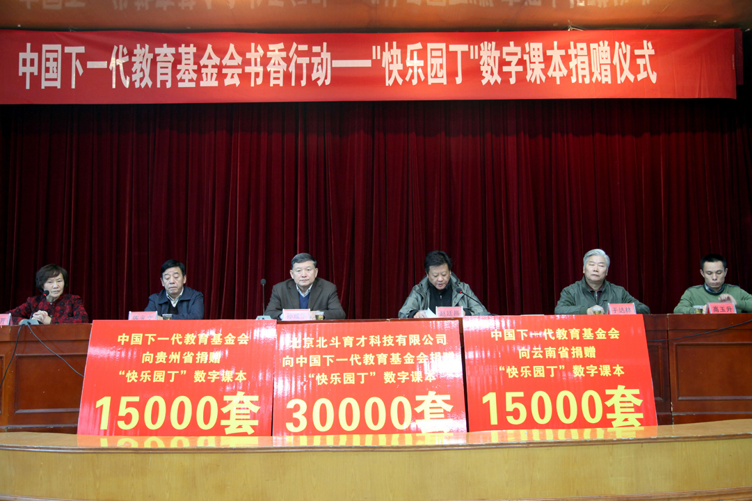 按照《国家中长期教育改革和发展规划纲要(2010-2020年)》要求,为加快教育信息化的步伐,促进义务教育均衡发展,实现优质教育资源共享,中国下一代教育基金会联合北京北斗育才科技有限公司向贵州、云南两省中小学捐赠价2940万元的“快乐园丁”数字课本30000套。2013年11月29日在贵州省贵阳市隆重举行了捐赠仪式。