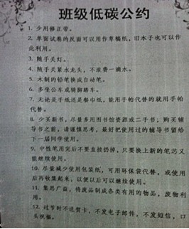 ![]() 新疆石河子市中学生自制的班级低碳公约书 |