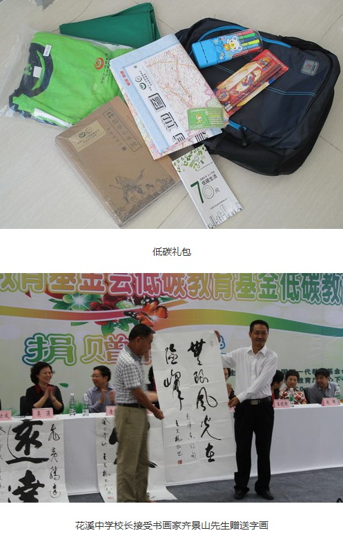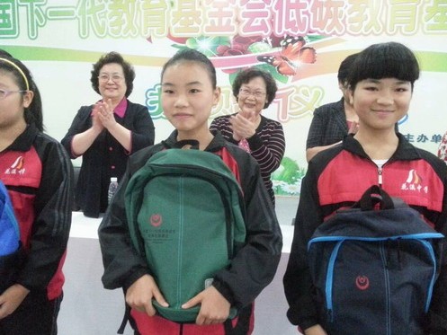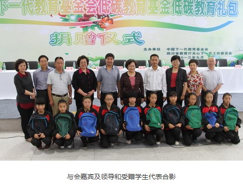 9月23日上午,在四川洪雅县花溪中学举行了现场捐赠仪式。雅安市、洪雅县的中小学生各获赠1万个低碳教育礼包。原中纪委驻财政部纪检组组长、中国下一代教育基金会副理事长贺邦靖,中国下一代教育基金会副理事长兼秘书长王萍,教育部关心下一代工作委员会秘书长赵晖,中国下一代教育基金会副秘书长吴涓,北京习知友教育科技研究院总裁、低碳教育基金常务副主任冯洋,四川省委教育工委副书记王晓都,四川省教育厅关工委常务副主任唐朝纪等同志出席了捐赠仪式,并为灾区学生赠送了低碳礼包。四川省教育厅关工委领导向中国下一代教育基金会低碳教育基金、北京习知友教育科技研究院赠送锦旗。