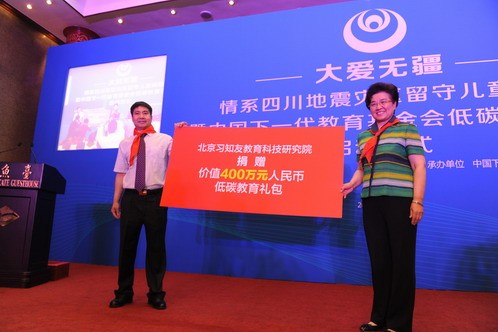 继今年5月29日,在钓鱼台国宾馆举行的“大爱无疆—— 情系四川地震灾区留守儿童捐赠暨中国下一代教育基金会低碳教育基金启动仪式”上,北京习知友教育科技研究院承诺,通过中国下一代教育基金会低碳教育基金,向四川地震灾区少年儿童捐赠总价值400万元人民币的2万个低碳礼包后,已于暑假期间将礼包全部运抵四川雅安市和洪雅县的78所中小学。