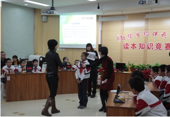 启动会上,北京市西城区白纸坊小学作为首批受赠学校,以“知识竞赛”的形式展示了学校本学期来开展《勤俭节约伴我行》读书实践活动的收获。白纸坊小学的王红校长还介绍了学??苟潦槭导疃奶寤幔乱徊交疃氖缘阃乒闾峁┖芎玫慕杓?。