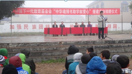 2013年12月27日上午,在云南省景洪市勐海县曼恩学校举行了中国下一代教育基金会“中华魂捐书助学献爱心”援建活动捐赠仪式。 中国下一代教育基金会捐书助学基金向勐海县捐赠了 10 个“中华魂爱心书屋”和40台电脑。