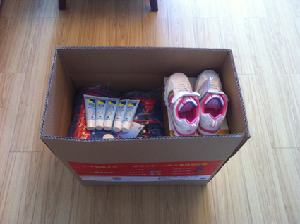 ![]() 每一箱爱心包裹都含有五双童鞋、五个书包、五支护手霜 |