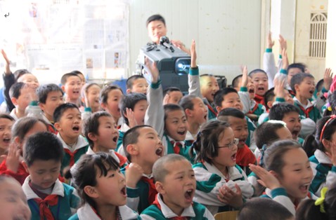 本次活动的第一站北京昌平雨竹学校,这所学校创建于2001年,是一所专门接受流动儿童就读的全日制民办学校。这里的孩子大多来世偏僻农村,但他们身上却透着那种昂扬、自信、进取的精神。因为场地有限,我们只能选择三年级两个班的80名学生,在学校食堂里观看影片。其他同学因为没有机会走进来,有的只能趴在门口,探着身子往里张望,那一双双渴望的眼神,令人心酸。有的同学说,这是他第一次看电影。