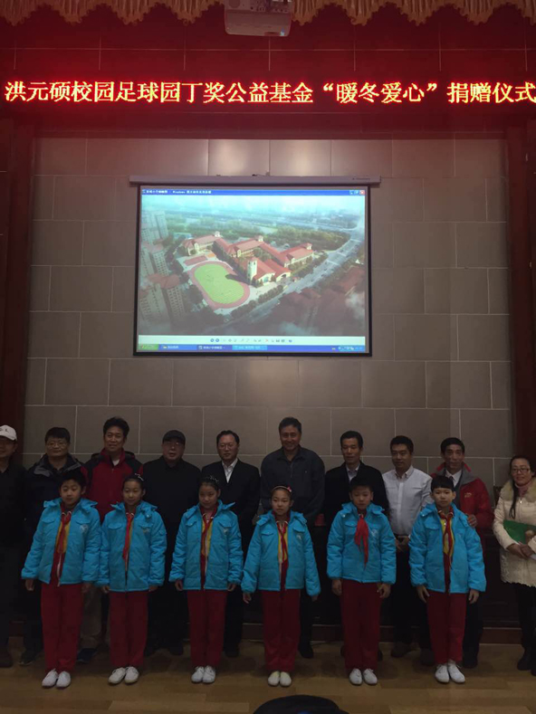 12月28日,洪元硕校园足球园丁奖公益项目向天津市蓟县第八小学的留守儿童捐赠了65件爱心棉服。这批棉服是由栗盈之、肖啟灿等28名北京的小朋友、爱心人士一起购买的,希望老区的小伙伴们在寒冷的冬天也能享受到温暖、愉快的户外运动。中国邮政体育邮局同时捐赠了北京申冬奥成功明信片、体育爱心包裹等文体用品。在天津市蓟县第八小学开展暖冬爱心棉服捐赠活动
