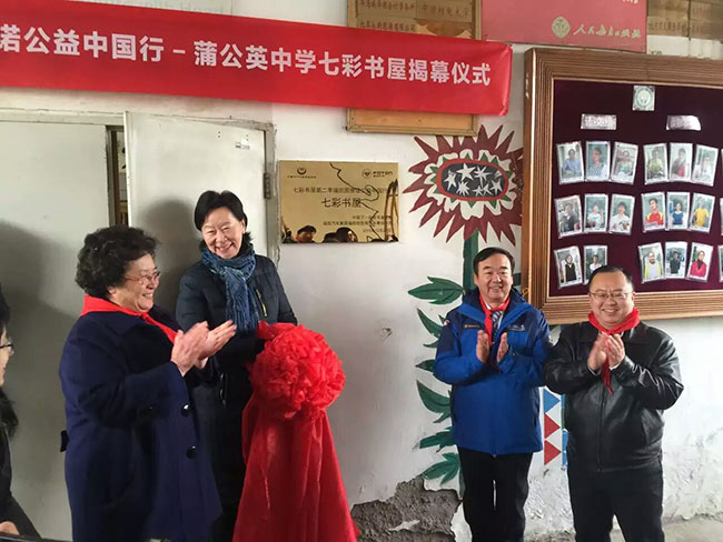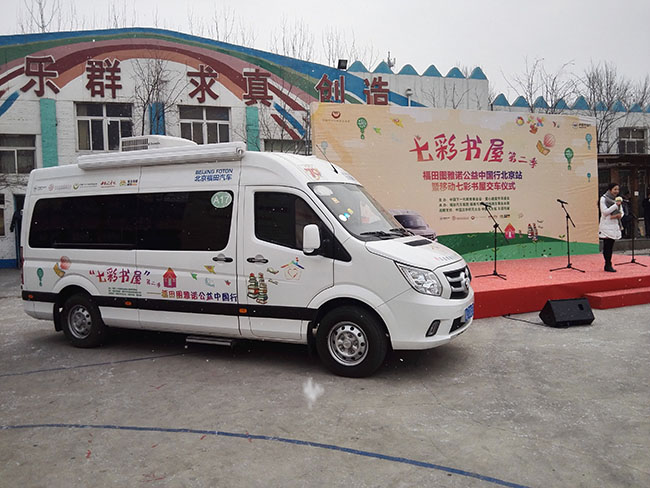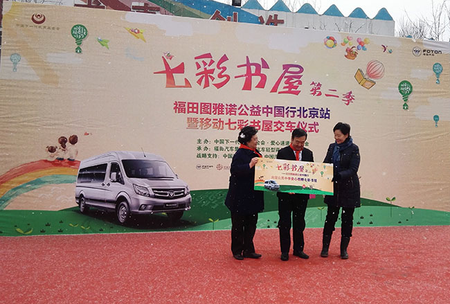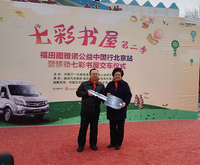 2015年12月27日,“七彩书屋”公益项目走进北京大兴区蒲公英中学,福田汽车集团党组副书记赵景光、中国下一代教育基金会理事长兼秘书长王萍、蒲公英中学校长郑红、中国下一代教育基金会爱心速递专项基金秘书长可勒出席了本次活动。