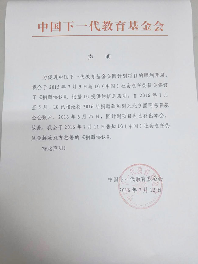 声明:解除与LG(中国)社会责任委员会签署的《捐赠协议》