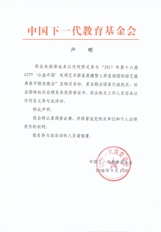 中国下一代教育基金会未批准也未以任何形式参与“2017年第十六届CCTV‘公益中国’电视艺术新星展播暨七彩星球国际综艺盛典春节联欢晚会”及相关活动,更未联合国家行政机关、社会团体向社会颁发各类荣誉证书,中国下一代教育基金会相关工作人员亦未以任何名义参与此活动。