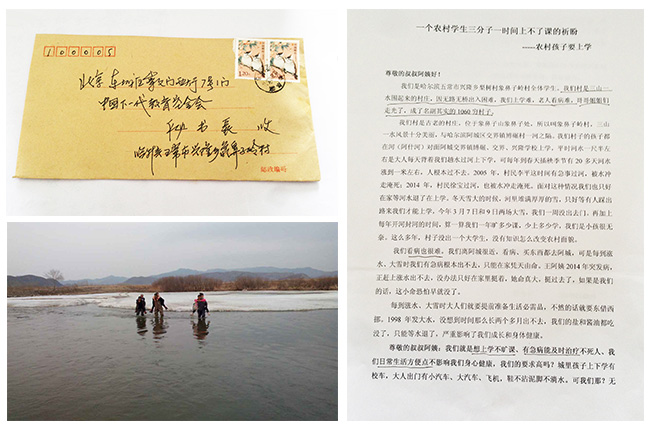 村里的孩子们需要到河对面的邻村学校去上学,阿什河水羁绊住他们的脚步,每天只能靠大人背过河去。孩子们渴望享有正常上课的权利,沉寂的村庄祈盼拥有一座桥,冬季可不淌刺骨的冰水,雨季可不越上涨的水位。因为无桥,孩子们有三分之一的时间都上不了课。在万般无耐的情况下,村里的孩子们联名给中国下一代教育基金会寄出求助信,诉说他们的苦恼和祈盼。