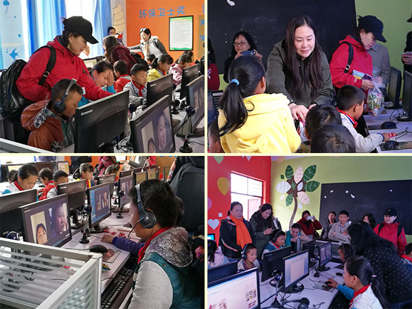 学生们利用午间休息时间与家长们视频聊天,考察组也与学生家长亲切互动,向学生们赠送小礼物。