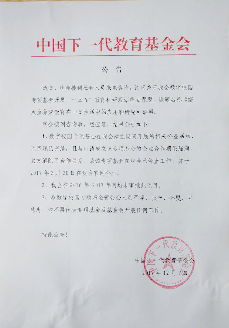 3、原数字校园专项基金管委会人员严萍、张宁、孙旻、尹慧忠,均不再代表专项基金及基金会开展任何工作。