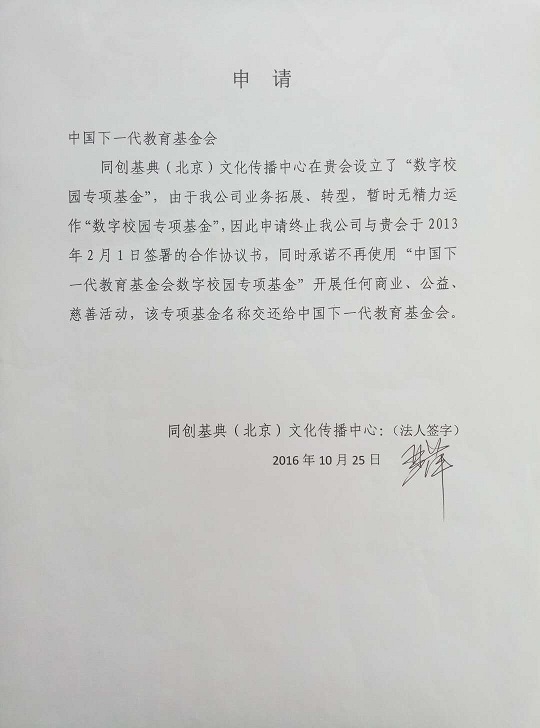 1、数字校园专项基金在我会建立期间开展的相关公益活动、项目现已完结,且与申请成立该专项基金的企业同创基典(北京)文化传播中心合作期限届满。