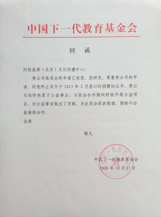 2、双方于2013年2月1日签署的合作协议书,于2016年10月27日到期后,解除合作关系,并将终止合作的公告于2017年3月30日在我会官方网站公示,故该专项基金在我会已停止全部工作。上述内容曾于2017年12月7日在我会官方网站上发布过公告。